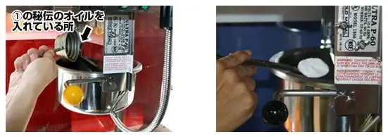 2回目からは、材料を用意し、全てのスイッチをONにして、ケトルとマシーンのギアがかみ合っているか確認して直ぐに、1.秘伝のオイル 2.豆 3.塩の順番に入れてください。(時間が空いてケトルが冷えてしまった場合は①の最初から繰り返してください。)