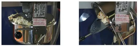 はね終わったら(豆と豆のはじける音の間隔が最初に5秒間隔になったら)、ケトルヒータースイッチとモータースイッチをOFFにして、素早くハンドルを回し、ケトルのポップコーンをマシーンの中にあけます。 この時ライトスイッチはONのままです。(モータースイッチがONのままだとギアがかける場合があります)