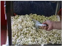 ④はね終わったら、ケトルのポップコーンをマシーンの中に空けます。